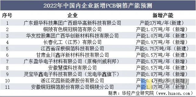 2022年中國(guó)內(nèi)企業(yè)新增PCB銅箔產(chǎn)能的預(yù)測(cè)